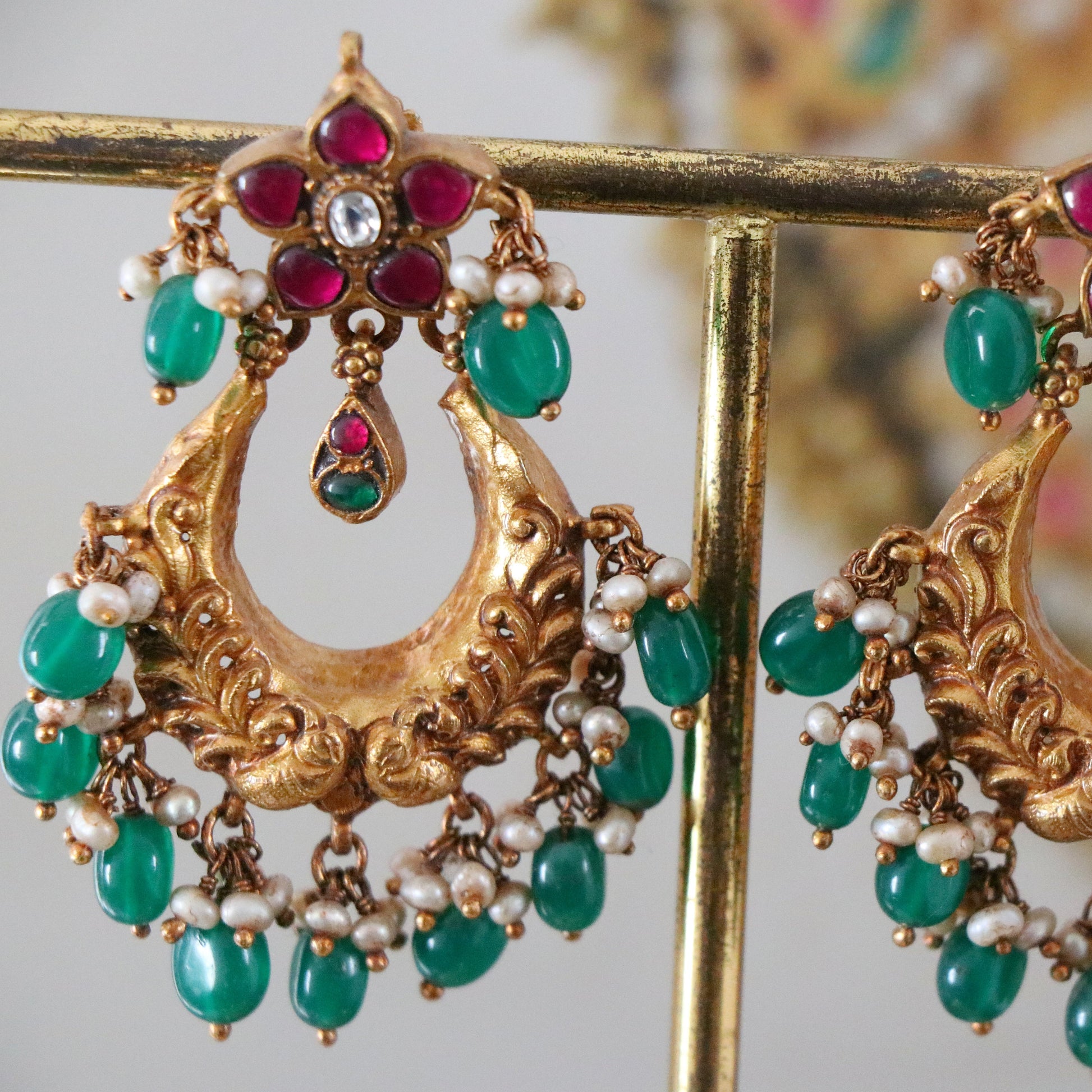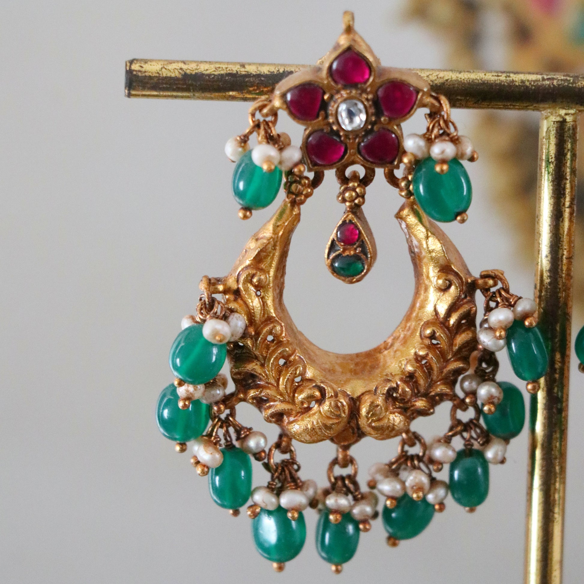 Hangings or bead drops: green onyx beads white balls and white pearls.