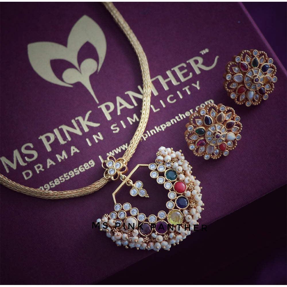 PLAIN CHAIN WITH NAVARATHNA CENTER PENDANT-NEK1839,NEK1838